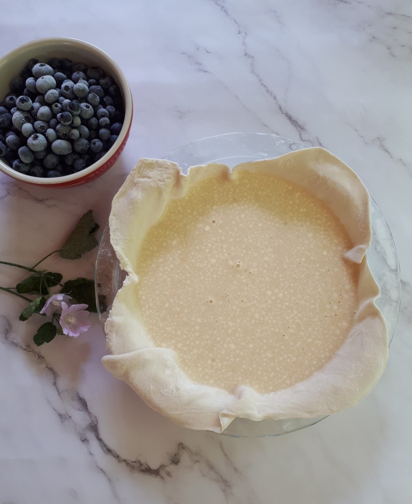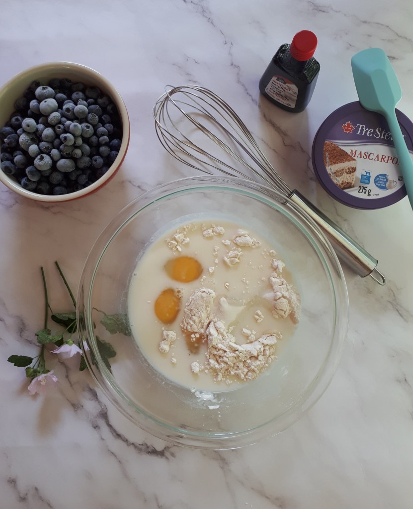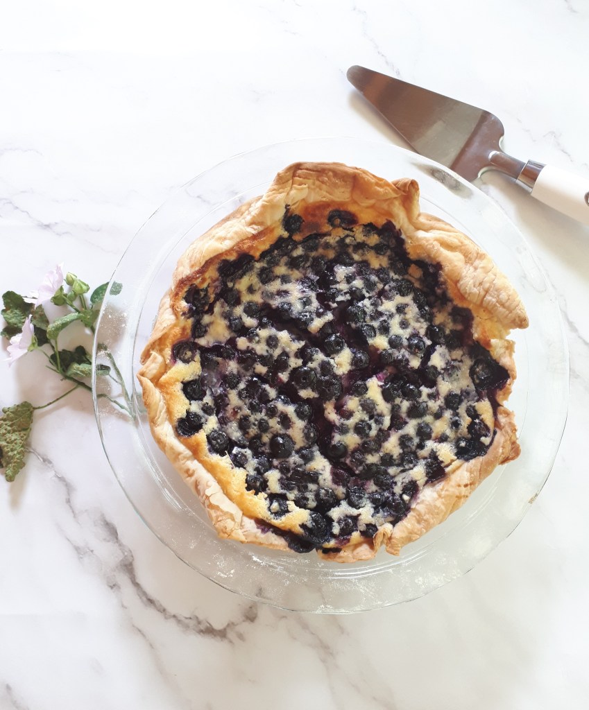 Il y a quelques semaines, j’ai eu la chance d’aller cueillir des bleuets à La Bleuetière la Maison des Délices, située à l’Ange-Gardien, et j’ai fait le plein de bleuets au congélateur. J’avais envie de créer une tarte crémeuse avec des bleuets comme un gâteau au fromage aux bleuets. Mais je n’avais pas de fromage crémeux, donc j’ai créé une nouvelle recette en utilisant seulement ce que j’avais au frigo. Techniquement, c’est entre une tarte, un clafoutis, un flan et un gâteau au fromage.
