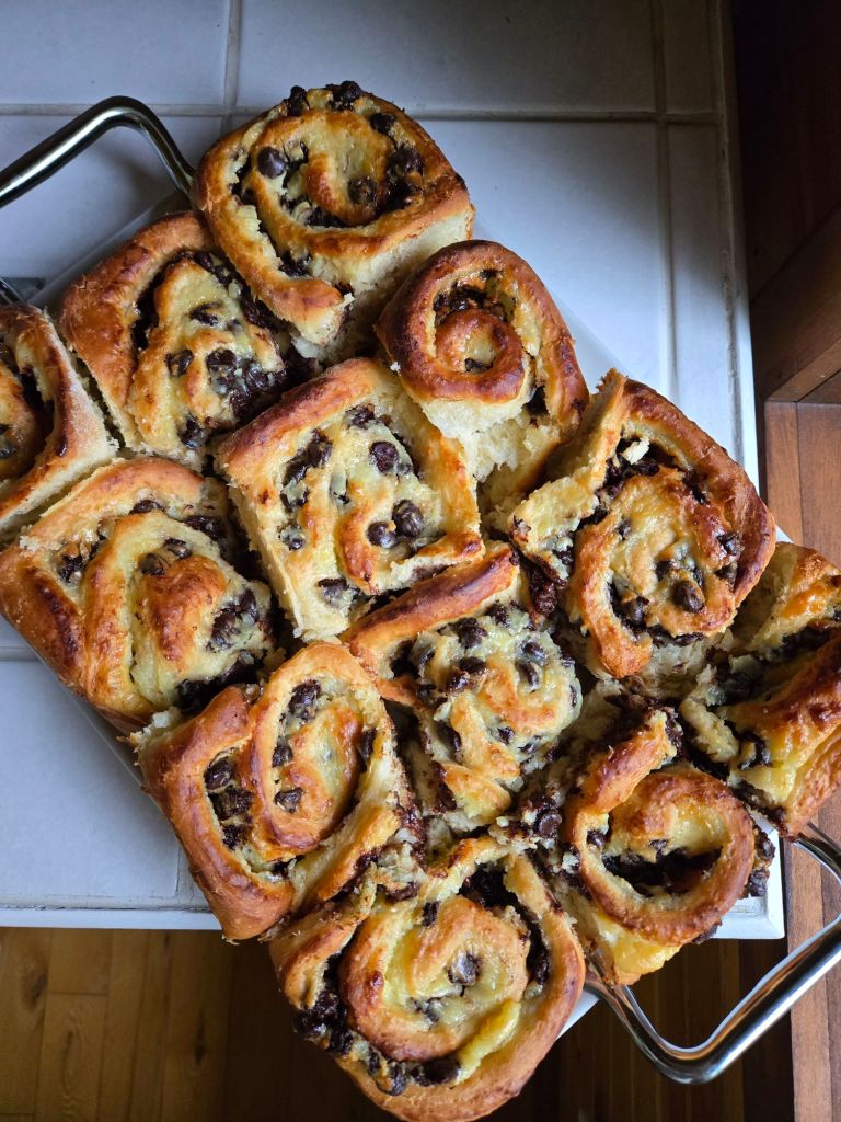 Une fois la pâte reposée, étirez la pâte à l’aide d’un rouleau à pâte pour créer un grand rectangle. Étalez la crème pâtissière et les brisures de chocolat. Roulez la pâte sur elle-même et découpez-la en 12 morceaux égaux. Dans un plat graissé, déposez les morceaux de brioches. Laissez reposer 1h.