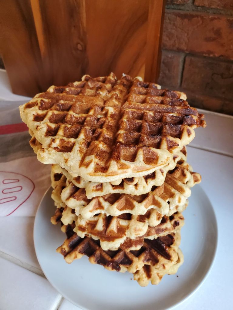Une fois la pâte reposée, faites chauffer votre gaufrier bien huilé. Mouillez bien vos mains et divisez la pâte en pâtons de 100g (environ neuf portions). Ajoutez le pâton à votre gaufrier et faire cuire selon les paramètres de votre appareil. Cuire votre gaufre une deuxième fois. Laissez vos gaufres refroidir sur une grille.
